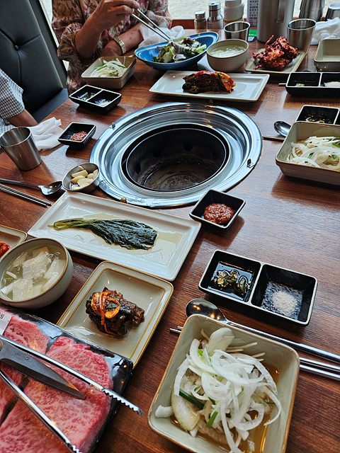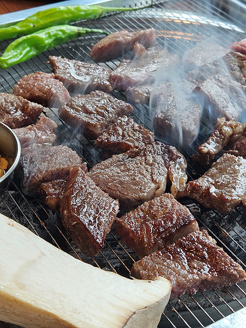 그 아름다운 표정 아래에 한우가 맛있게 익어가는 모습을 볼 수가 있다.